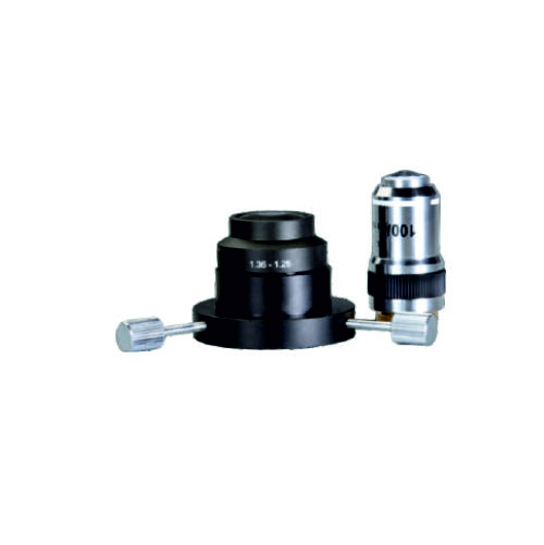DARK FIELD CONDENSERS: Dark field condenser with centering screws N.A 1.20-1.33 & achromatic Objectives 100x (SL) oil immersion within built iris diaphragm.