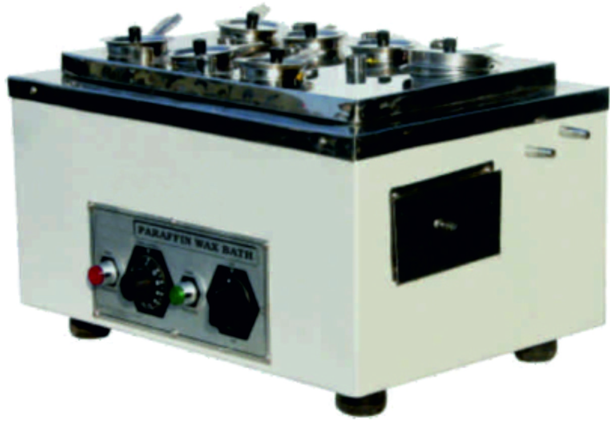 PARAFFIN BATH (Thermostatic Control WBR/PF Series)– Double wall construction. Outer body made of mild steel duly epoxy powder coated. Inner chamber made out of stainless-steel sheet. Gap between the walls filled with glass wool to avoid thermal loses. Temperature from 5°C ambient to 95°C controlled by capillary Thermostat. Workable on 220/230 Volts AC.