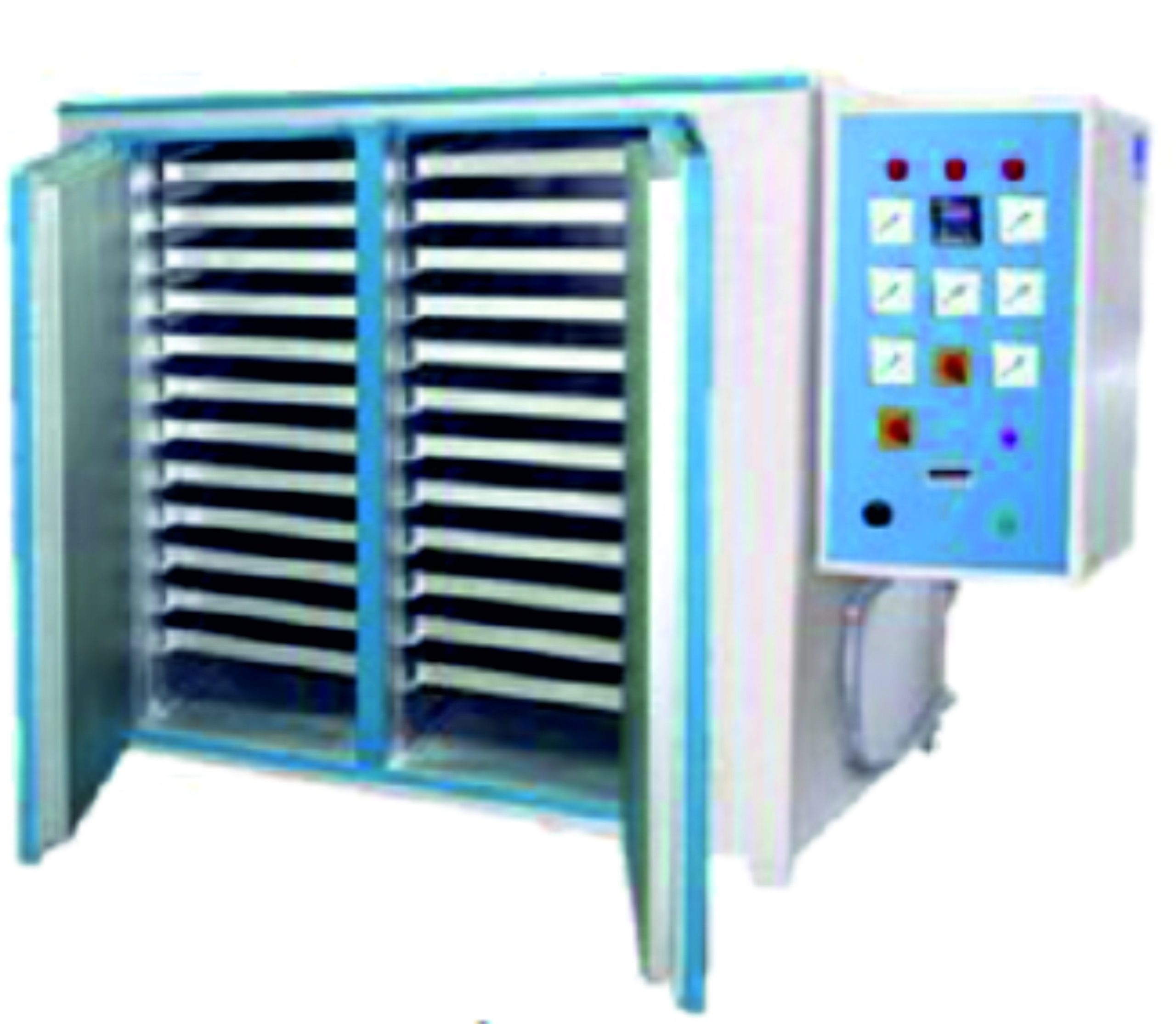 TRAY DRYER (OV-TD Series Digitally Controlled): – Body is fabricated on heavy duty angle channel frame with outer body made of Mild Steel sheet dully painted in hammer tone paint or in powder coating paint and inner body made of Stainless-Steel sheet. The 75mm gap between the two walls will be Filled by high grade temperature resistant glass wool as insulation. Air circulation fan blade motor is given to circulate the heat in the chamber and to maintain equal Temperature on all sides. Temperature range +5ºC ambient to 250 ºC controlled by digital temperature controller cum indicator with a high-class panel attached on the body.